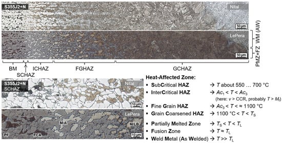 To evaluate the material effect of induction heating in wet welding of structural steels, the microstructure was analyzed in cross-sections. For a more precise metallographic investigation of the welded region, two preparation techniques were used in a complementary manner to better contrast the microstructure, cf. ref. [47]. A common grain etching with Nital (3% nitric acid in ethanol) was employed to analyze the ferritic matrix. Furthermore, color tint etching according to LePera (4% picric acid in ethanol and 1% sodium metabisulfite in distilled water mixed in 1:1 volume ratio) was used to highlight high-carbon martensite and residual austenite phases (M/A), see Figure 3.