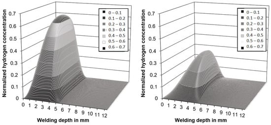 Calculated hydrogen distribution in the simplified weld model, after 300 s without (left) and with induction heating (right).