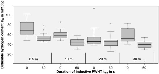 While the results are not valid in a quantitative way, as the diffusion coefficients are not known for the real microstructures found in wet weldments, the trends justified the experimental effort necessary for measurements of the diffusible hydrogen content in accordance with ISO 3690. As the base metal, unalloyed structural steel of grade EN 10025-2-S235 (CEV = 0.31 wt%) was chosen. The parameters used were identical to those shown in Table 1. A total of n = 340 samples were welded to ensure statistically meaningful data. The best results were obtained with the maximum power (100%) and 60 s induction duration (n = 103 analyzed samples). Tests with lower induction power or lower PWHT times resulted in insufficient influence on hydrogen concentration and were neglected in the following. The results of the corresponding hydrogen measurements are shown in Figure 6.