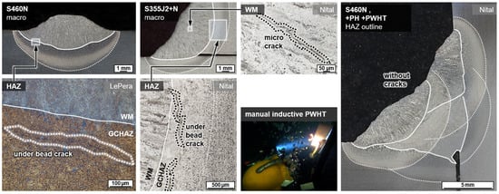 Wet welding typically results in very high cooling rates due to the convective heat transfer by the surrounding medium. Thus, for C-Mn construction steels, shear-dominated phase transformations were triggered in the weld metal and the HAZ. The result was a typical microstructure with high strength, but low ductility and toughness, cf. Figure 3. These microstructures were particularly susceptible to cold cracking and HAC. Some of the bead-on-plate welds with the unalloyed structural steel grade S355J2+N already showed macroscopic underbead cracks (length > 500 µm) in the grain coarsened heat-affected zone (GCHAZ) parallel to the fusion line. Furthermore, microscopic cold cracks could be detected sporadically in the weld metal, cf. Figure 7. Exemplarily, the positive influence of additional induction heating was demonstrated for a relatively critical application of underwater SMAW fillet welding of S460N. A test piece could be wet welded with three passes without the occurrence of cracks. The induction was applied for pre-heating (PH) as well as PWHT for every run. The induction power was 100% and the induction head was moved manually on a length of about 100 mm for 60 s.