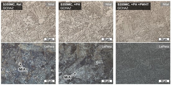 The effect of a tempering treatment using inductive PWHT was further validated by investigations using the thermomechanical rolled fine grain steel S355MC. This steel usually shows M/A microphases because of the local segregation of alloy elements in interferritic areas. These microphases could be detected by LePera’s etchant, cf. Figure 9. The usage of induction technology induced a temperature field that was intense and wide enough to even cause annealing transformations in the underbead HAZ region. Thus, M/A was tempered, and no white islands remained in GCHAZ.