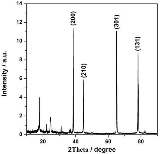 Powder X-ray diffraction was employed to study the crystal structure of the synthesized catalytic materials. The X-ray diffraction patterns of NFeC@rGO-COOH recorded at a 2θ range from 10° to 90° are displayed in Figure 1. The synthesized catalytic material exhibited a broad diffraction peak at 2θ = 24.7°, which corresponded to the (111) reflection plane, which is characteristic of the rGO_COOH carbon support []. After pyrolysis, the diffraction patterns of the catalyst (NFeC@rGO-COOH) appeared at angles of 17.96, 22.22, 30.47, 31.54, 36.84, 38.49, 44.70, 65.07, 78.16, and 82.38. The diffraction peaks at 2θ = 38.49, 44.70, 65.07, and 78.16 were related to the (200), (210), (301), and (131) reflections, respectively, confirming the partial decomposition of PB during calcination, as well as the presence of additional coexisting phases FexC with the PB []. The obtained diffraction peaks are narrow, indicating the system’s crystalline structure and the considerably large sizes of PB.