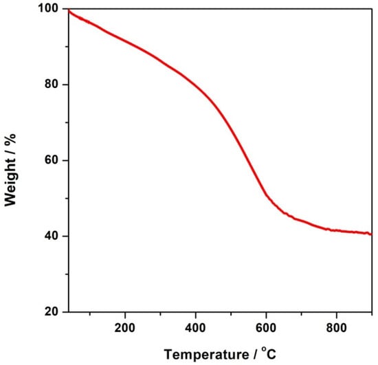 The TG curve the CFeN@rGO-COOH catalyst sample under N2 from 25 to 900 °C is shown in Figure 2. The corresponding measurements displayed a gradual weight loss in the range of 25 to 400 °C, which accounted for ~20% of the initial weight loss, which was due to the loss of adsorbed and coordinated water molecules. The notable mass loss observed above 400 °C was related to the decomposition of CFeN@rGO-COOH, indicating the Prussian blue was thermally stable up to 400 °C, which is more stable than analogous hexacyanometallates []. Therefore, the calcination of Prussian blue at a particular temperature has an impact on the generation of new active catalytic centres due to the partial or complete decomposition of its structure.