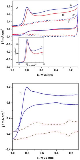 The cyclic voltametric (CV) curve of CFeN@rGO-COOH catalyst in a deoxygenated electrolyte is shown in Figure 7, which exhibits mainly a rectangular shape with high background current density, is a typical attribute of carbonaceous materials. Furthermore, a small and poorly defined reduction peak appeared in the potential range of 0.7–0.8 V. The catalytic materials in the presence of an external magnetic field showed slightly higher background currents (curves b’ and a’ in Figure 7). For the reference catalyst (20% Pt/C), not show here, the same measurement was performed. The electrochemical behaviour of Pt/C nanoparticles in alkaline media in the presence of external magnetic field was similar to that in its absence.