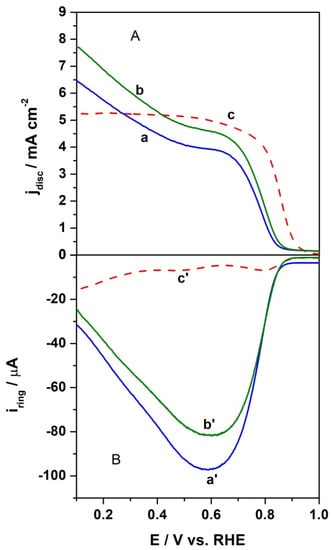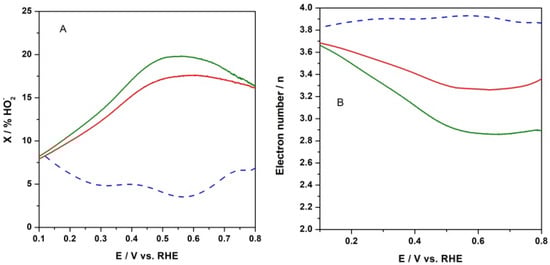 Furthermore, based on the RRDE measurements (Figure 10B), the number of electrons exchanged per oxygen molecule (n—defined as the arithmetic average) were thereafter computed as a function of the applied potential, utilizing the following equation: