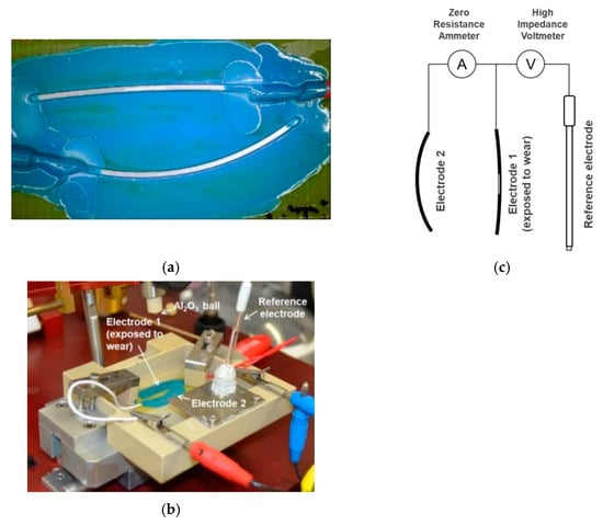Experimental setup: (a) preparation of specimen with the straight (electrode exposed to wear) and curved (counting electrode) part of the archwire, glued to a glass-reinforced epoxy laminate sheet; (b) experimental setup with important parts highlighted; (c) schematic representation of the electrochemical noise measurement setup.