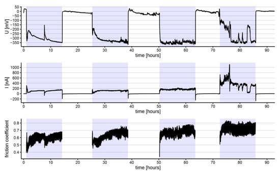 Electrochemical potential (U), current (I), and coefficient of friction measured on an in-vivo aged SS archwire (highlighted sections represent intervals where the specimen was exposed to tribocorrosion cycles).