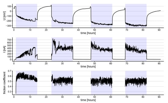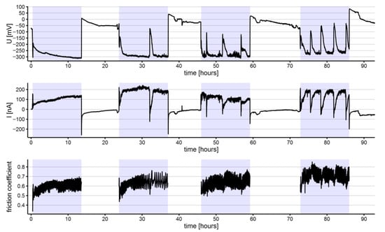 Electrochemical potential (U), current (I), and coefficient of friction measured on an in-vivo aged NiTi archwire (highlighted sections represent intervals where the specimen was exposed to tribocorrosion cycles).