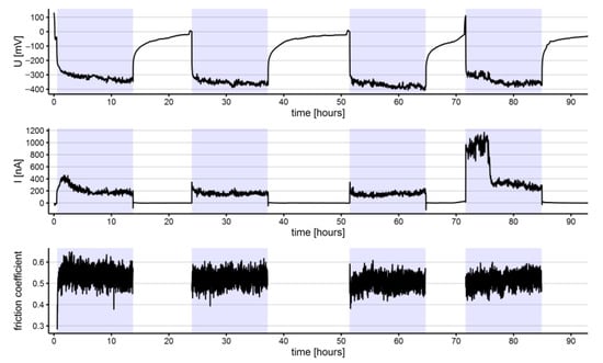 Electrochemical potential (U), current (I), and coefficient of friction measured on an as-received SS archwires (highlighted sections represent intervals where the specimen was exposed to tribocorrosion cycles).