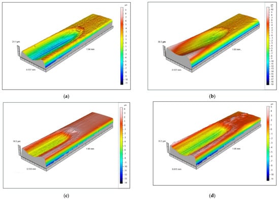 The three-dimensional profiles of as-received and in-vivo aged NiTi and SS archwires after tribocorrosion experiments are shown in Figure 6. The profiles of the archwires were generally comparable, but specific differences existed. The greatest depth (between 20 and 30 μm) was measured for the in-vivo aged NiTi archwire (Figure 6b), whereas the depths on the other archwires were roughly similar (between 5 μm and 10 μm). It can also be seen that the longitudinal profiles of the damage on these three archwires (as-received NiTi, as-received, and in-vivo aged SS) are generally symmetrical, while the profile on the in-vivo aged NiTi archwire is uneven. Due to the limited spatial resolution, it was impossible to quantify the perpendicular profiles. However, longitudinal scratches were somewhat more visible on the SS archwires (Figure 6c,d) than on the NiTi archwires (Figure 6a,b). Hence, the profiles of the tribocorrosion tracks on the NiTi archwires are slightly smoother than those of the SS archwires. In addition, the profiles on the as-received archwires appear rougher than those on the in-vivo aged archwires.