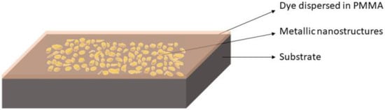 Films of Rhodamine 6G dye (R6G, 252433, Sigma-Aldrich, St. Louis, MO, USA) dispersed in polymethylmethacrylate (MICROCHEM 950 PMMA A4 from Kayaku Advanced Materials, Inc., Westborough, MA, USA) were coated on top of the nanostructured metallic films. We tested three concentrations of C1 = 50 µM, C2 = 10 µM and C3 = 5 µM dye in in solution of PMMA 4% in anisole. The PMMA-R6G layer was deposited by spin coating using SUSS MicroTec LabSpin 8 (SUSS MicroTec SE, Garching bei München, Germany) employing three deposition speeds (3000, 4500 and 6000 rpm).