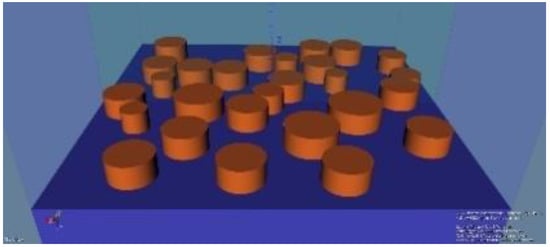 We performed simulations to evaluate the enhancement of the excitation field and of the fluorescence emission as well, due to plasmonic resonances appearing between the meta-atoms of the random metasurface. To determine whether the proposed structures offer localized electromagnetic field enhancement and plasmonic resonances, which can increase the excitation rate of fluorophores on a silicon substrate, we numerically analyzed a metallic metasurface using a three-dimensional (3D) finite-difference time-domain (FDTD) method. The simulation of a random structure is not a trivial task. To overcome this challenge, we designed a supercell (Figure 2), which consisted of a random distribution of nanocylinders with random diameters, imposing periodic boundary conditions with the mention that this can induce an artificial periodic effect. We consider that this effect does not significantly modify the results regarding the field enhancement due to the large number of nanopillars contained in the supercell. On the propagation direction (Z), the absorbing perfectly matched layer (PML) conditions were employed to minimize the reflections that could occur when the incident radiation touches the boundary.