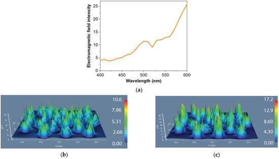 (a) Electromagnetic fields average enhancement as a function of wavelength: (b) Field configurations for a silver random metasurface at the wavelength of 480 nm; (c) Field configurations for a silver random metasurface at the wavelength of 550 nm.