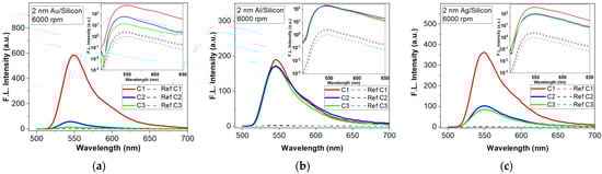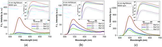 On top of the metallic nanostructures, layers of PMMA doped with R6G in three different concentrations were deposited. Figure 5 shows the fluorescence intensity of R6G in the presence of metallic metasurfaces in comparison with the reference. In the inset of the figures, a graph in the logarithmical scale is presented in order to show the magnitude orders. The improvement of fluorescence by Au metasurfaces is small for lower concentrations of fluorophores in the PMMA layer (Figure 5a). Only for high concentrations of R6G in PMMA (C1) was a significant improvement of fluorescence emission observed. The same behaviour can be seen in the case of Ag metasurfaces (Figure 5c). In the case of aluminium metasurfaces, the concentration has a very low influence on the improvement of the fluorescence emission (Figure 5b). This is due to the really thin nanostructures (hights between 3 and 5 nm, see Table 3) that can accommodate, nearby, only a limited number of fluorophore molecules, approximatively independent of the dye concentration. The advantage of these Al structures is that they offer the best improvement of fluorescence intensity for the thinnest layers of fluorophore dispersed in PMMA.