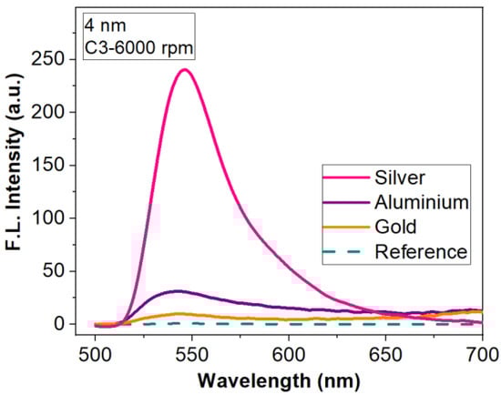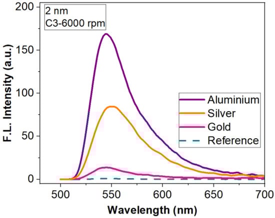 Thus, florescent emission intensity is higher (289 fold) when using an Ag metasurface due to the geometry and the spatial separation of the meta-atoms. For Au and Al, the presence of percolations increases the radiative decay, the effect being a quenching of the fluorescence intensity, showing small improvements of 12- and 38-fold, respectively. Figure 9 presents the influence of the metasurface structures on the fluorescence emission spectrum for C3—R6G:PMMA deposited with a rate of 6000 rpm for 40 s.