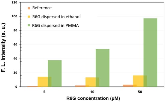 To highlight the advantage of fluorophore dispersion in PMMA, we also analyzed the intensity of fluorescence emission for R6G dispersed in ethanol and deposited on 4 nm-thick Al–based metasurfaces. In Figure 10, one can that even if the fluorescent response of the R6G/ethanol layer coated on a metallic metasurface is higher than if we have only the silicon substrate, the intensity obtained when R6G was dispersed in PMMA is much higher. The role of PMMA is to protect the fluorophore luminescent properties from degradation when drying in normal atmosphere.
