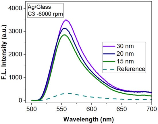 Taking into account the results obtained on silicon substrate, we continued the study of the FLEN on glass substrate for the metallic layers with thicknesses of 15, 20 and 30 nm Ag prepared in the same conditions as before. The results are presented in Figure 13. As one can see, the fluorescence intensity improvement factor reaches values up to 11 times for the 30 nm layer compared to the reference (R6G:PMMA on glass).