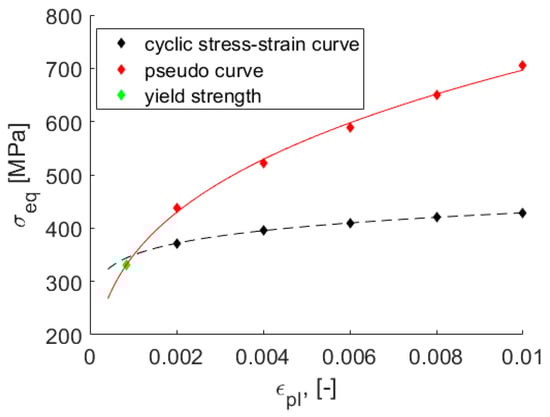 Pseudomaterial approaches are based on material behavior that couples either elastic stress with elastic–plastic strain or elastic strain with elastic–plastic stress. The behavior of the material can be represented by a pseudocurve that is analogous to the static/cyclic stress–strain curve (Figure 1). In the case of the pseudostress–real plastic strain curve, which is used in this work, the pseudomaterial experiences stresses that correspond to the stresses related to a purely elastic solution, while it plasticizes according to its real material response at the same time.