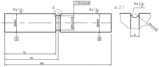 Specimen with U-notch. A and B in frames indicate surfaces based on which a datum axis for geometrical run-out tolerance is defined.