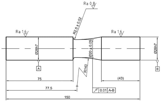 To verify the approximation method, fatigue experiments were carried out on two types of notched samples (Figure 2 and Figure 3) manufactured from aluminum alloy 2124-T851. The Young’s modulus of the material was 73,100 MPa [31], Poisson number was 0.33, and Hollomon parameters for the Ramberg–Osgood curve were K = 646 MPa and n = 0.089. Cyclic yield strength of 330 MPa was used for the FEA simulation and for the approximation method.