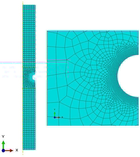 Specimens were modeled as axisymmetric. The same mesh was used for both elastic and elastic–plastic analyses. The final mesh size of the quadratic axisymmetric stress elements CGAX8R (8-node biquadratic, reduced integration) was 0.1 mm (Figure 5). Attempts to further decrease the element size did not affect the results by more than by 0.007%. All elements passed the mesh quality check without errors and warnings.