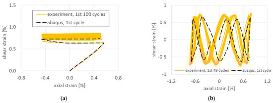 The coincidence of the responses from the experiments and from FEA (Figure 6) at the initial loading and at the beginning of cyclic loading suggests that the elastic data were valid. There were small differences in cyclic regions that could have been caused by the absence of a ratcheting parameter in the combined hardening model of plasticity in Abaqus.