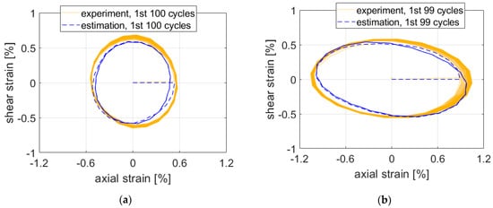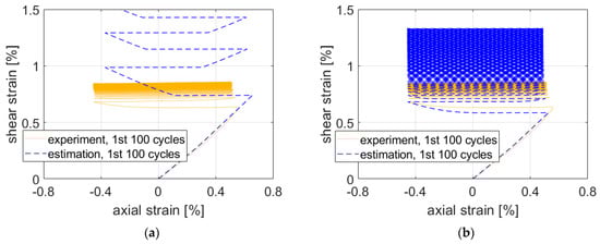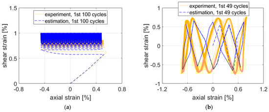 For the NV path, both channels had sinusoidal waveforms. The loading frequency of the torsion channel was five times faster than that of the tension compression channel. For the digital image correlation (DIC) measurement, which was carried out for the first 49 cycles, frequencies were 0.004 Hz for the torque channel, and 0.02 Hz for the force channel. Other authors used this path to validate other approximation methods [7,8,9,11,14,15].