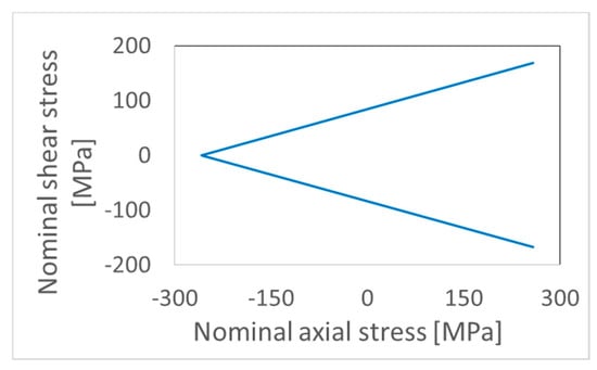 The approximation method itself was implemented in MATLAB. The only input for the program was the stress history of the notch tip of the elastic FEA and the material data presented in Section 2.3. The cyclic stress–strain material curve was defined using Hollomon parameters for five sections of plastic strain with a step of 0.02 and the first value corresponding to a cyclic yield strength of 330 MPa. The pseudocurve was established according to the process described in Section 2.1.1.