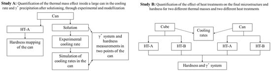 In this work two studies are proposed: first of all, a quantification, through modelling and experimental characterization, of the effect of sample’s thermal mass, within a big can, in the cooling rate and γ′ precipitation after solutioning. These results have been discussed and related with the mechanical properties of the material. On the other hand, samples with two different dimensions (small cube and big can) have been HTed with two different HT and their microstructure have been analyzed and related with their mechanical properties. The following figure summarizes the work presented in this paper, see Figure 1.