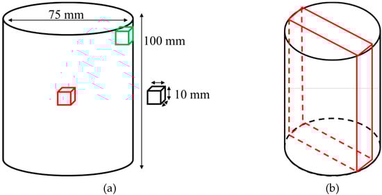 (a) Scheme of the can and cube dimensions, both after HIP, for study B. Additionally, the can microstructural analysis areas were pointed out, in red and green, for study A. (b) Extracted can slice for hardness mapping, study A.