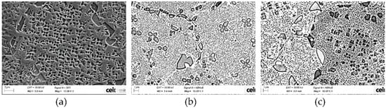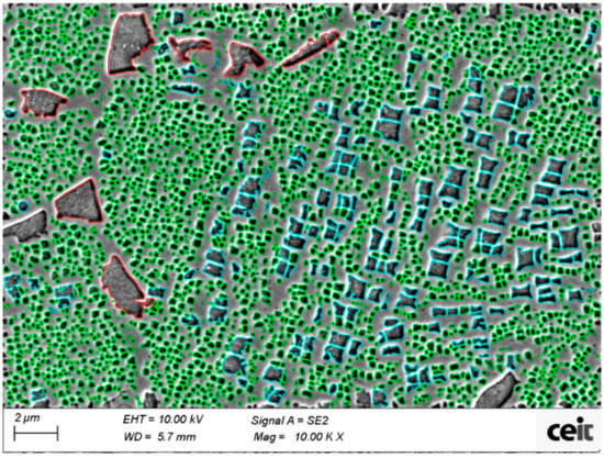The program evaluates the area of every γ′ precipitate and the total γ′ area; moreover, it is worth mentioning that this analysis was carried out on two-dimensional images, although reality is three dimensional, and it was assumed that results could be extrapolated from area fraction to volume fraction. In addition, γ′ precipitates can be classified into three types according to their size and shape: primary γ′, secondary γ′ and tertiary γ′, see Figure 4. Furthermore, γ′ precipitates that were in the images edges were removed from calculations in order to reduce possible source of uncertainty in the results of relative γ′ distribution and size calculations. However, there were included for the total γ′ quantity. Five images at 10 kX magnifications were taken in order to do a proper analysis (equivalent to 2579 μm2, with tens of thousands of precipitates involved).