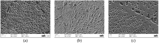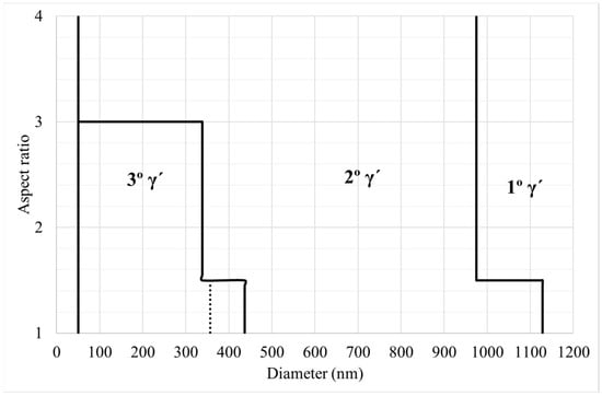 γ′ precipitates were classified as primary, secondary, and tertiary γ′, taking into account the size and aspect ratio of the precipitates. Figure 5 illustrates the parameters established for that classification in a graph. The effectiveness of classification has been checked by specific control images. In addition, particles with an area lower than 0.002 μm2 were classified as noise, in order to reduce possible uncertainty of the measurement. This value was found by an empirical approach. Cube samples have a smaller tertiary γ′, thus for them it was used a smaller tertiary γ′ size in order to improve the separation between tertiary and secondary γ′ (see Figure 5).