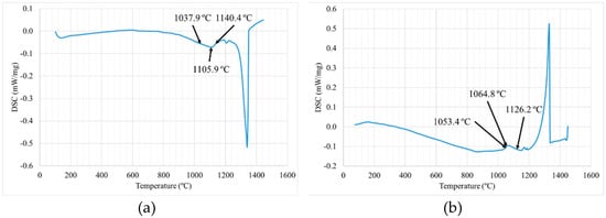 Differential scanning calorimetry (DSC) measurements were performed on a STA449 F3 JUPITER with a furnace of Rhodium capable of reaching 1600 °C on an alumina crucible. The DSC cycle has 3 steps. First, heating from 25 °C to 1450 °C. Then, a maintenance step of 15 min at 1450 °C. Finally, cooling from 1450 °C to 25 °C. The heating and cooling rates of the process were 10 °C/min. Every measurement was performed twice in order to obtain sharper peaks in the second cycle.