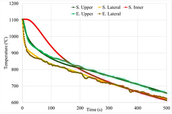 As it can be seen in Table 3, the experimental and simulated cooling rates are very similar. Therefore, the model was considered validated and the simulated cooling rates have been used in this work in order to have coherent results between the external cooling rates and the inner one. The inner part of the can has a different thermal profile compared with the outer, due to the different heat transport phenomena. The external part of the can is in contact with a cold fluid, the air, so the temperature difference is very high, and this increases the heat flux, but the inner part is in contact with more Astroloy, at high temperature, in all the directions, which produces lower temperature differences and a lower flux of heat.