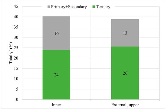 From the quantitative metallographic analyses, it can be deducted that both areas have similar overall γ′ content and similar γ′ distribution (Figure 11). However, there is an important change in the tertiary γ′ size and density of precipitates. Tertiary γ′ size is coarser in the inner part than in the external part, whereas the number of precipitates is inversely proportional (see Figure 12). These microstructural differences are marked by the precipitation rate during the cooling process.