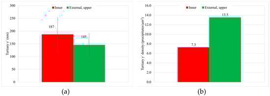 Tertiary γ′ (a) size and (b) density of precipitates after solution treatment in the inner and external upper part of the can.