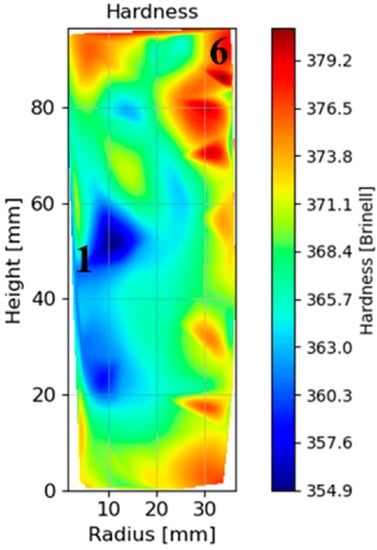 After HT-A, hardness measurements were carried out in a central slide of the can. A hardness map of the whole surface was performed obtaining information from 80 points. The results show a variation in the hardness level between the inner and the external upper part of the can, areas 1 and 6, respectively (see Figure 13). In the mapping analysis, a unique indentation was performed in every point, the exact position of the indentation was measured in every case.