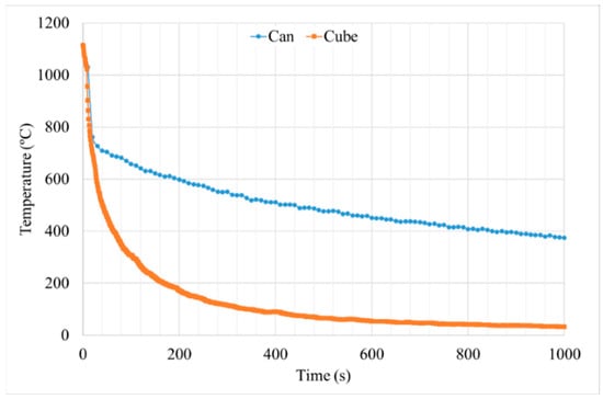 As it was mentioned above, temperature evolution in the HTs cycles was measured with an external thermocouple. The cooling rate in the surface of both samples is high at the beginning of the cooling step. Then, both samples continue the cooling process with a lower cooling rate, but the cube sample temperature decreases much faster than in the can. This tendency is repeated for all the steps, but it was included only the solution step of the HT-A sample as an example (see Figure 14). This is related to the sample’s thermal mass: as sample size increases, the mass that is needed to be cooled down increases, taking more time for the cooling process. As it was mentioned previously, the cube sample has a volume of 1 cm3, whereas the can volume has approximately 440 cm3 of Astroloy after the HIP process. Therefore, the can sample cools down much slower than the cube. The variation of the temperature with time for the can was recorded in its lateral area.