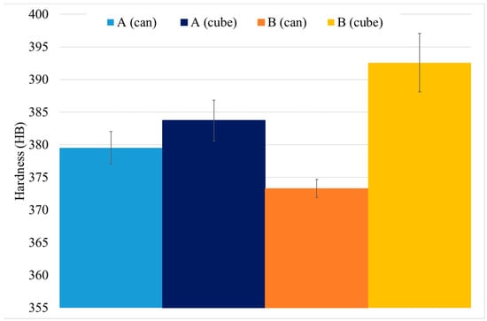 As expected, HTs increase the material hardness: 317 ± 8 HB 30 for as-HIP and above 370 HB 30 after HTs. However, this increase depends on the material’s size or mass and performed HTs. As it can be seen in Figure 15, there are small differences in hardness due to those effects, cube samples have higher hardness. Moreover, the difference in hardness for HT-B sample is higher than in HT-A.
