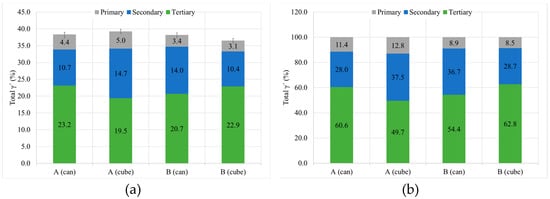 γ′ properties of the samples with HT-A and HT-B for the can and cubes, including (a) the general content and total area percentage and (b) relative distribution.