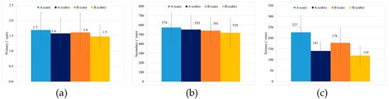 γ′ size by population of the samples with HT-A and HT-B for the can and cubes, (a) primary, (b) secondary and (c) tertiary.