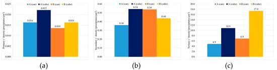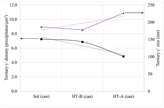 Total γ′ content of the four studied samples is similar, with a small decrease for samples with HT-B treatment, and tertiary γ′ is the more numerous strengthening precipitate in all the samples (Figure 17). In terms of γ′ precipitate size, can samples present larger precipitates than cubes. On the other hand, for samples with the same dimensions, material with HT-A treatment presents bigger precipitates than samples with HT-B treatment (Figure 18). Usually, when the precipitates are coarse their density is lower. This effect is very noticeable in the samples with similar overall γ′ content, where coarse tertiary γ′ precipitates show lower density than those which are thinner (see Figure 16b,c, Figure 18 and Figure 19).