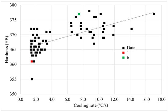 For this reason, a hardness mapping on the whole surface of a central slice was performed, after HT-A. The hardness values obtained were represented against the cooling rate after solutioning. In this case, the cooling rate was obtained between the initial temperature and 1000 °C, in order to have the assurance of being out of the γ′ precipitation range after solutioning. Moreover, points 1 and 6 were marked, since both locations were discussed previously.