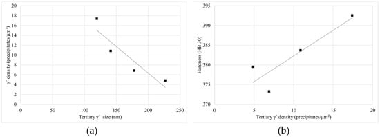 Relationship between (a) tertiary γ′ density—size and (b) tertiary γ′ density—hardness.