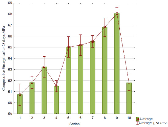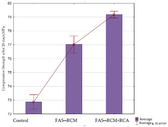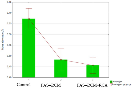 - The water absorption of concrete with recycled aggregates and the addition of FAS–RCM was very low (not exceeding 3.5%); this value was obtained as a result of the waste FAS–RCM and RCA affecting the sealing of the composite structure. Usually, low water absorption in concrete is obtained as a result of the use of expensive plasticizers or superplasticizers.
