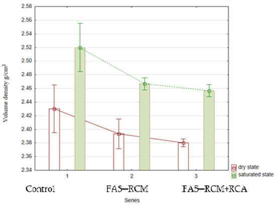 - Concretes based on FAS–RCM and RCA were characterized by low dry and saturated bulk density values (not exceeding 2.5 kg/dm3 in the case of 30% recycled aggregates).