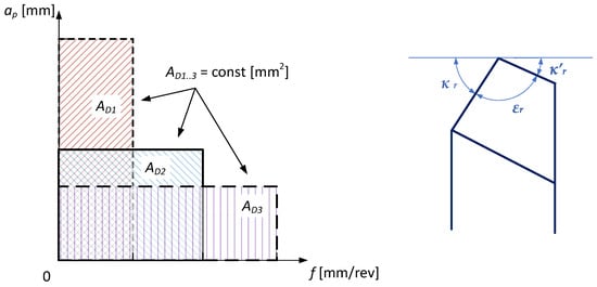 For materials of different groups (with a different chemical composition and structure) with the same tensile strength, the specific cutting force may change. Inconel 718 is a specific example because it hardens upon treatment. The value of the specific cutting force depends on the value of the cross-section AD. In order to determine the influence of the shape of the cross-section of the cutting layer on the value of the specific cutting force kc, two types of experiments were carried out. In the first case, tests of longitudinal turning of a tapered surface were carried out, i.e., at a constant value of the feed f and variable value of the depth of cut in the range ap = <0, 1> mm. In the second case, specific cutting force tests were carried out for various shapes of the cross-section of the cutting layer, maintaining a constant value of the cross-section AD. Figure 1 shows schematically the changing shape of the cross-section of the cutting layer with a constant value. The change in the shape of the cutting layer cross-section results from the selection of the proportions of the dimensions describing the cross-section of the cutting layer, i.e., the feed f and the depth of cut ap.