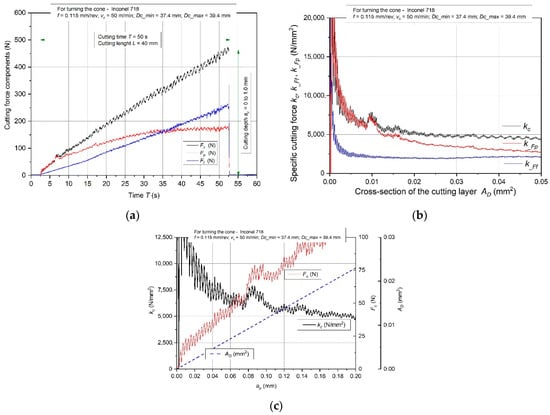Characteristics of the components Fc, Ff, Fp (a) with specific cutting forces (b) and specific cutting force kc during the initial phase of cutting edge work (c) for turning the cone made of Inconel 718 alloy.