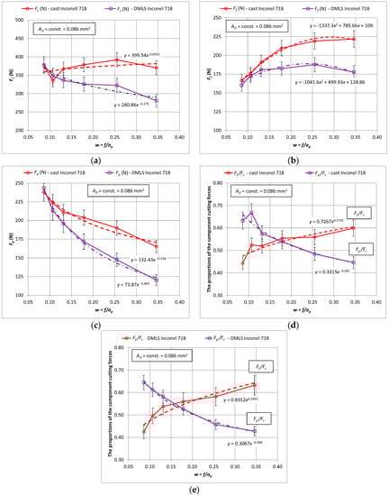 The characteristics of the components for turning with a constant cross-section of the machined layer AD = 0.8 mm2 for the printed and cast Inconel 718 alloy, (a) Fc component, (b) Ff component, (c) Fp component, (d) the ratio of the cutting forces Ff/Fc and Fp/Fc–cast material (e) the ratio of the cutting forces Ff/Fc and Fp/Fc–3D printed material.