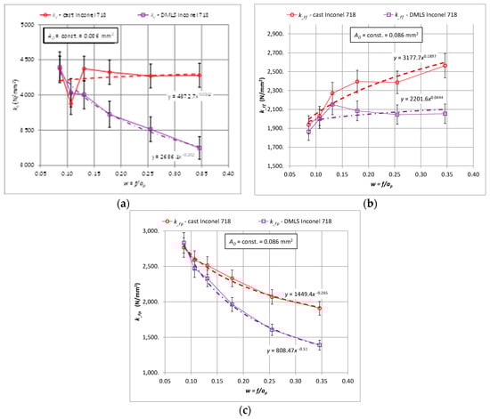 Relationship of specific cutting force for the components Fc, Ff, Fp for turning with a constant cross-section of the cutting layer AD = 0.8 mm2 for the printed and cast Inconel 718 alloy, (a) kc, (b) k_Ff, (c) k_Fp.